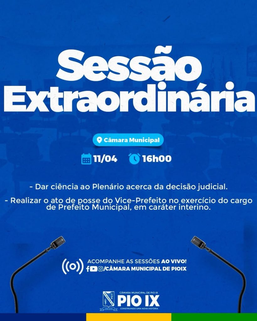 A Câmara Municipal de Pio IX realizará, no dia 11 de abril, às 16h, Sessão Extraordinária na sede do Poder Legislativo Municipal, reunindo os vereadores para apreciação de pauta de caráter institucional.
